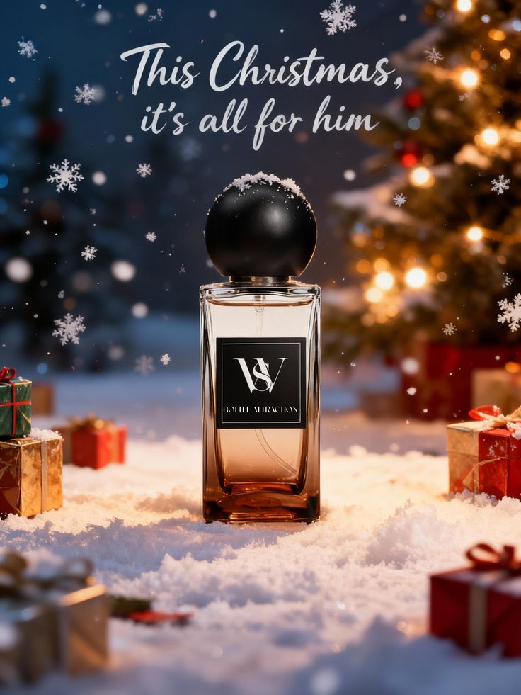 Prompt: “A high-end cinematic product photography shot of a luxury men’s perfume bottle centered in a snowy winter scene. The bottle is rectangular with a gradient amber-to-clear glass finish, featuring a prominent black square label with a white minimalist logo. It is topped with a matte black spherical cap dusted with light, realistic snow. The bottle sits directly in soft, powdery white snow. In the background, a blurred, warm-glowing Christmas tree with golden bokeh lights and small red ornaments creates a cozy atmosphere. Tiny, delicate snowflakes are frozen in mid-air. The lighting is a mix of cool blue twilight and warm golden glow from the festive lights. In the upper third, elegant white script text reads “This Christmas, it’s all for him.” Hyper-realistic, 8k resolution, commercial advertising style.”